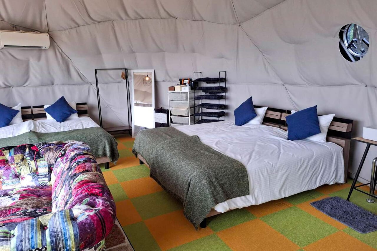 The first glamping tent on Awaji Island. The tent is a large cocoon shape, with an area of 40㎡. Of course, they are fully air-conditioned and comfortable in all seasons.
