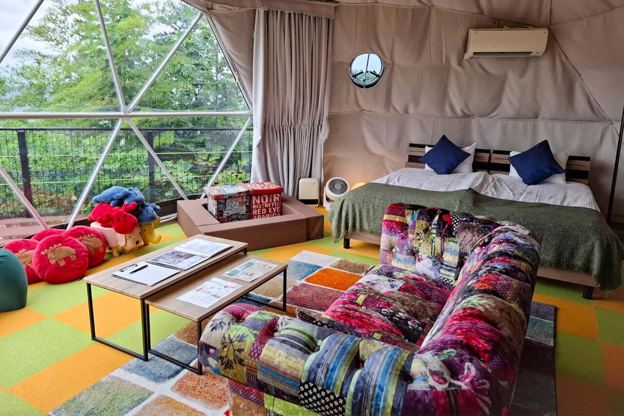 Dome tent with a diameter of 8m. The large guest room area of 50 square meters is fully equipped with air conditioning and heating, so you can stay comfortably in all seasons.